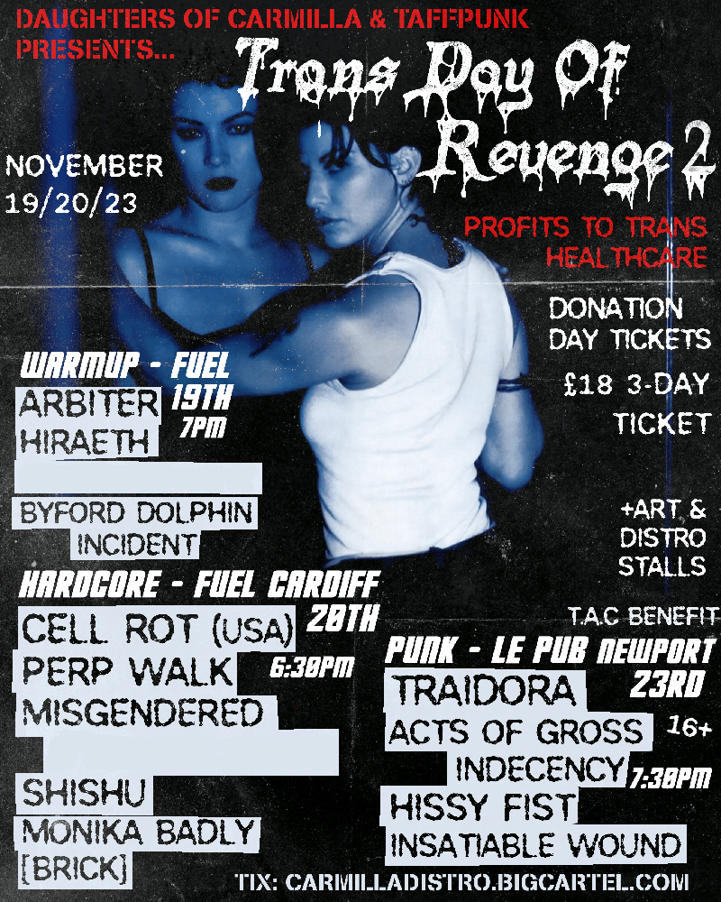 Coming back in collaboration with TaffPunk for the 2nd year is TRANS DAY OF REVENGE; a 3-day celebration of trans & queer heavy music where profits go directly to trans people in need! This year spreading over 3 days, 2 venues with 14 acts and stalls!
